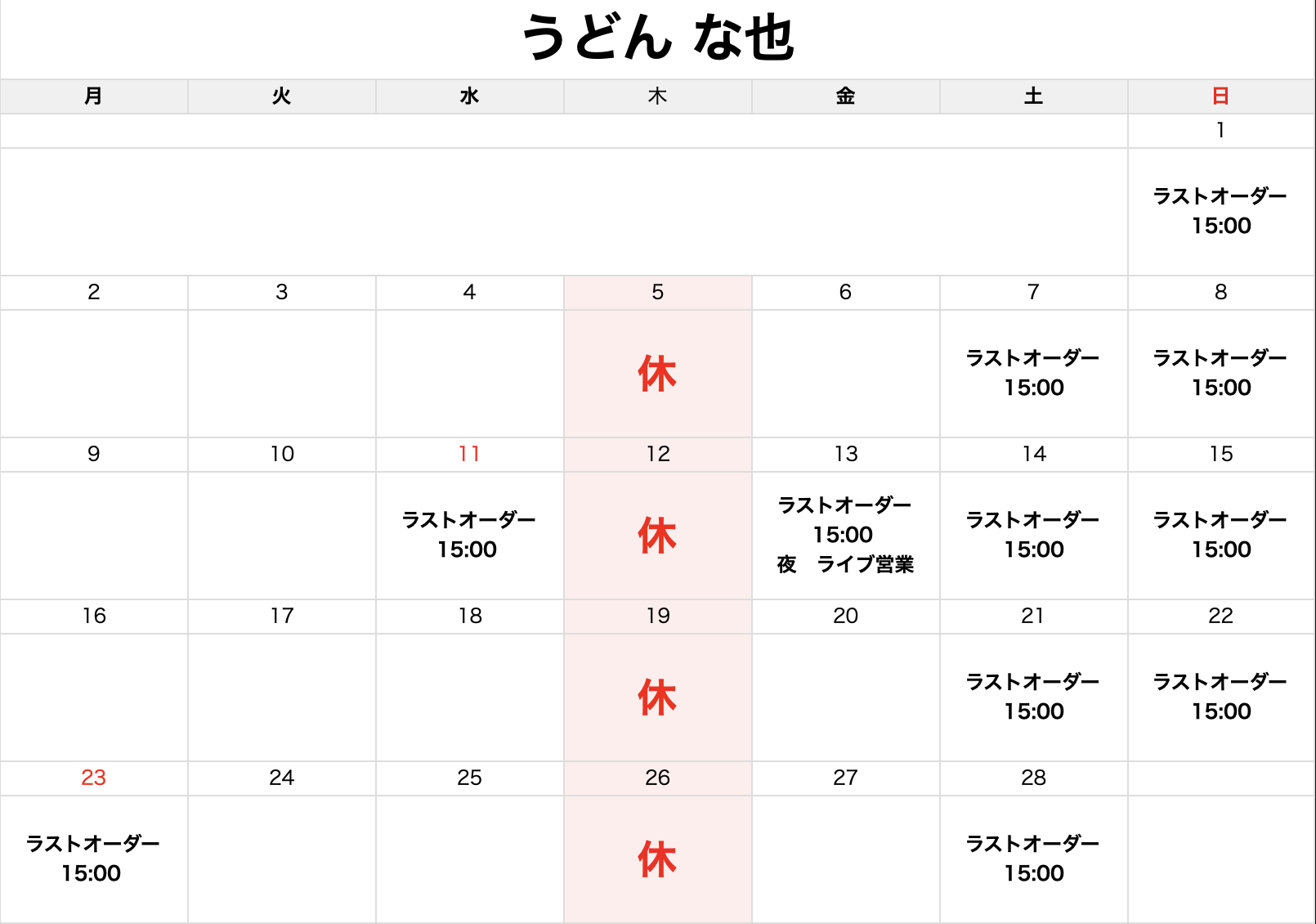 定休日 毎週木曜日